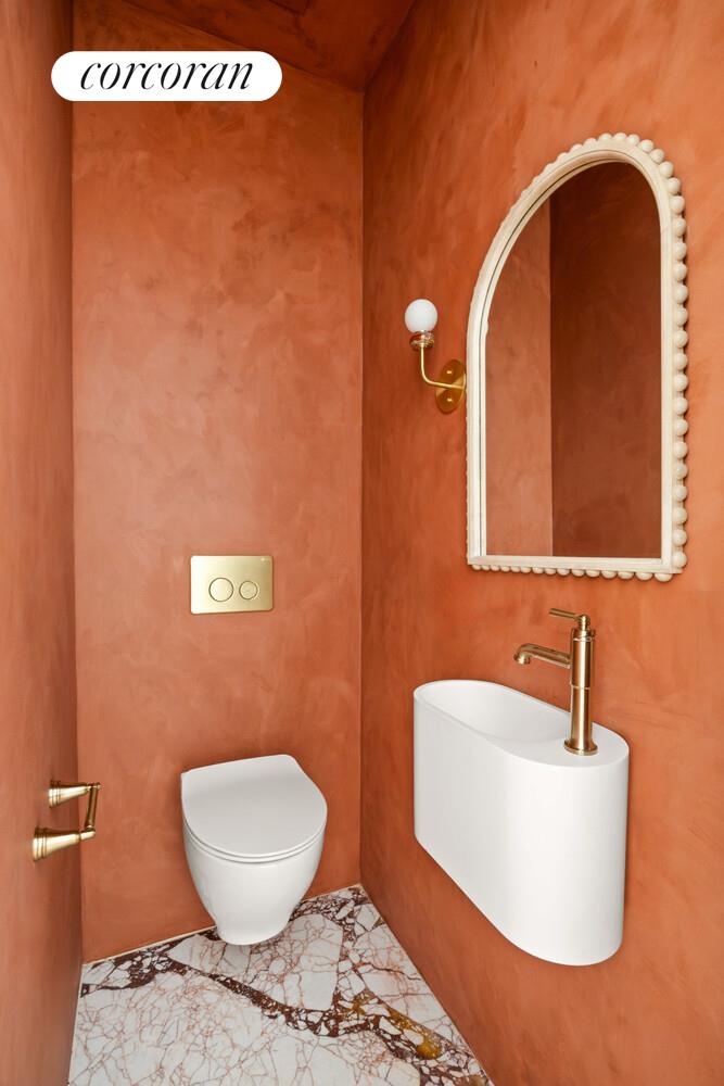 On the parlor level, two original fireplaces set the tone for elegant entertaining, while a sun-drenched bay window showcases restored 100-year-old stained glass in all its jewel-toned glory. Here's where the design magic truly reveals itself: marble accents on the fireplace hearths, custom newel post caps, kitchen window sills, and the powder room floor are all cut from the same luxurious slab as the kitchen countertops. This thoughtful continuity ties the home together, creating a visual rhythm that feels as cohesive as it is elevated. Even the powder room-tucked perfectly beside a discreet coat closet-is a jewel box moment. The parlor level also features a built-in Bose speaker system, bringing immersive sound to your entertaining and everyday living.