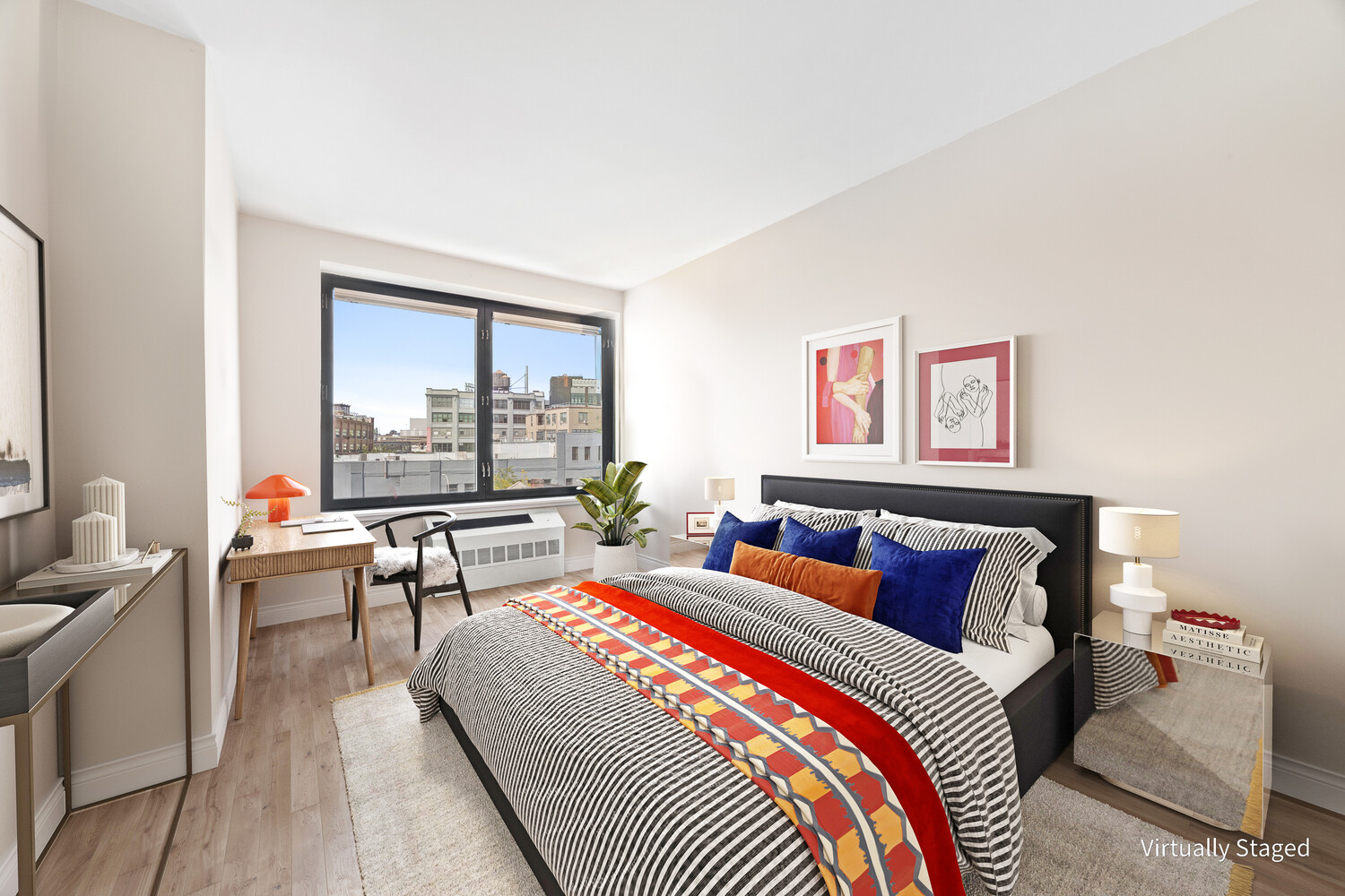 The primary bedroom is very generously sized to accommodate a king-sized bed, featuring over-sized windows with a partial Western Manhattan skyline view, and a spacious walk-in closet.