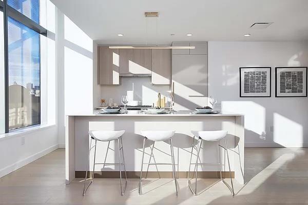 Gracious one bedroom, with a northeast exposure is available for early November move in. Unit 807 is a generously- sized residence highlighted by abundant natural light that pours in through the large curtain wall-style windows. You’ll enjoy the distinctive European white oak engineered wood flooring throughout, open kitchen consisting of cabinetry finished with sand ash veneer and extreme matte laminate, a Viatra quartz slab countertop and backsplash, top-of-the-line Bosch appliance package that includes a built in refrigerator, freezer with ice maker. A five burners gas stove with a vent out range hood, dishwasher and Monogram microwave. Unwind in the massive bedroom that easily fits King size bed and more. Elegant fully tiled bathroom with high-end finishes like limestone vanity, with elegant bronze Kohler Purist fixtures, a custom recessed medicine cabinet, luxurious Kohler Underscore tub, Toto toilet and outlet for bidet. A Bosch washer and dryer is also included for your convenience.