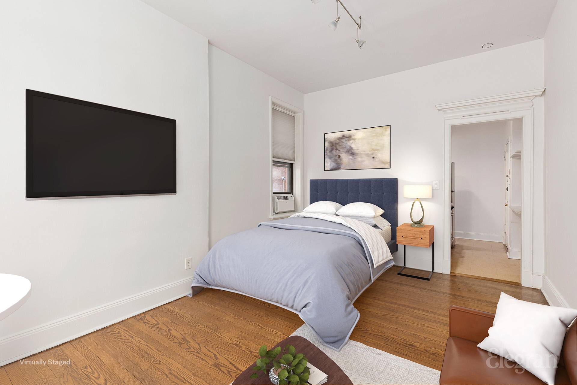 The home boasts beautiful hardwood floors, exposed brick walls, and a fully equipped galley kitchen. The windowed bathroom is complete with a full bathtub and classic subway tile, adding to the apartment’s prewar charm and functionality.