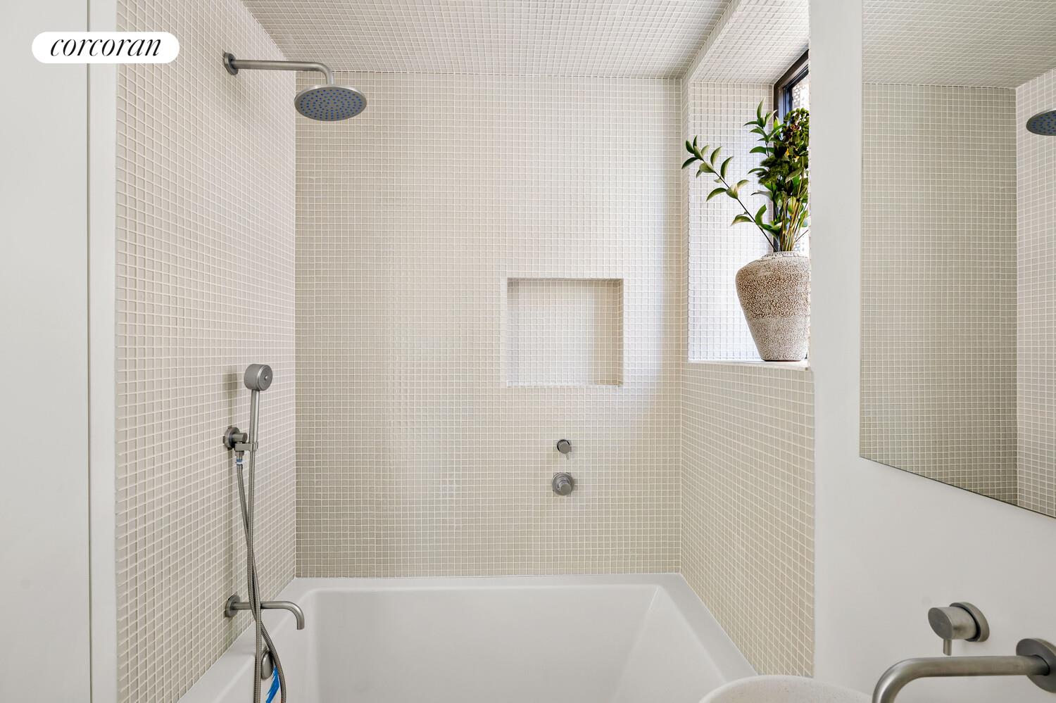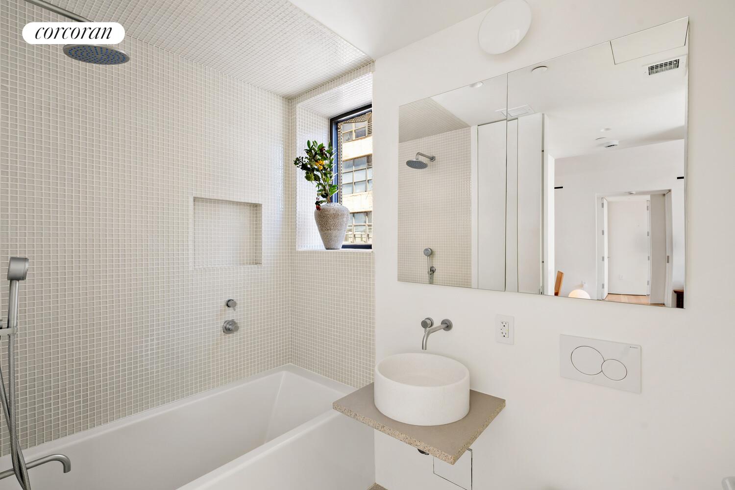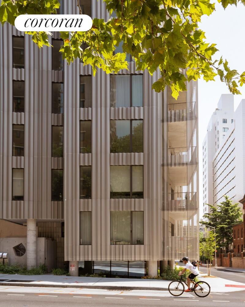 Residence 6C is an 1,164sf, corner two bedroom, two bath home offering north, south and east exposures, a private entry landing, and covered loggia overlooking the neighboring cathedral. The loggia is framed by a beautiful, perforated screen, which allows light to filter in but provides added privacy and weather protection making it a true extension of the interior. The expansive great room allows for a large dining table, and generous living area with a wall of glass facing the loggia. The kitchen is the focal point, with its gorgeous organically shaped island functioning as an additional gathering space. The primary bedroom offers a full wall of closets, and a stunning en-suite bathroom with dual sinks and walk-in shower. The secondary bedroom has corner exposures, a built in desk and a windowed hall bath with a white glass mosaic tub/shower.